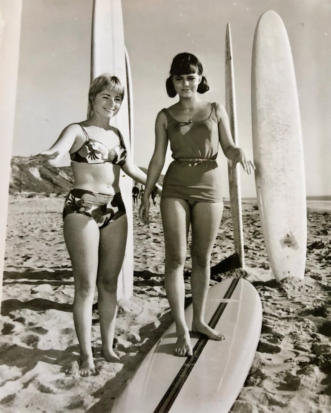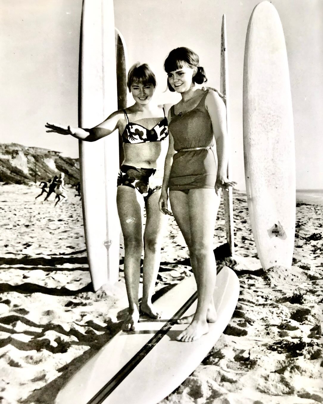 From 1959 to 1969, Benson won over twenty first-place surfing titles and was recruited to act as a surfing double for Annette Funicello in the “Beach Party” films, and as Deborah Walley in Gidget Goes Hawaiian, alongside surfing films by Bud Browne and John Severson. The photos below show Linda offering surfing advice to Sally Field, who played “Gidget” in the ABC TV series which aired in 1965.
