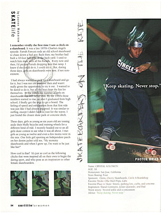 In 2002, the first issue of SurfLife for Women magazine was launched and also included a “Skatelife” article, which honored Cherry Skateboards through a board giveaway, including photos of Crystal, as a sponsored rider. Crystal is 16 and shared that her worst injury was a twisted ankle and concussion, but advises girls to “Kep skating. Never stop.” The photos show a kickflip sequence bottom left and a noseslide.