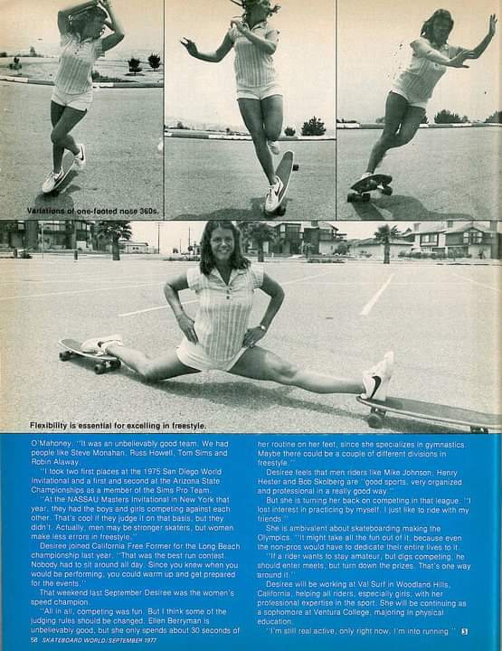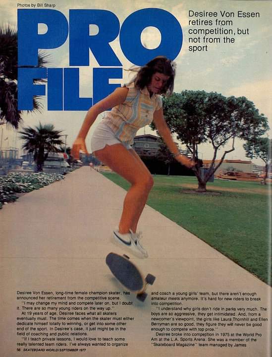 Desiree was given a “Pro File” interview in the September 1977 issue of Skateboard World, acknowledging her early influence in contests, and decision to stop competing, as she lost interest in practising her routine alone and would rather just skate with her friends.