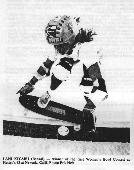 Kiyabu wished that more girls were competing, and her favourite skaters were Vicky Vickers and Ellen Oneal. Kiyabu had actually collided with Vickers in the Doubles bowl event at the Newark contest, but there were no hard feelings. Di Dootson reported that, “It was a fast bowl, and deep. In their Doubles practise Lani and Vicki collided in the bottom as both were coming down from the lip. Lani was hurt a bit but Vicki was hurt with internal injuries and taken to the hospital. Both girls are fine now but Vicki was laid up for a week. A sobering incident.”