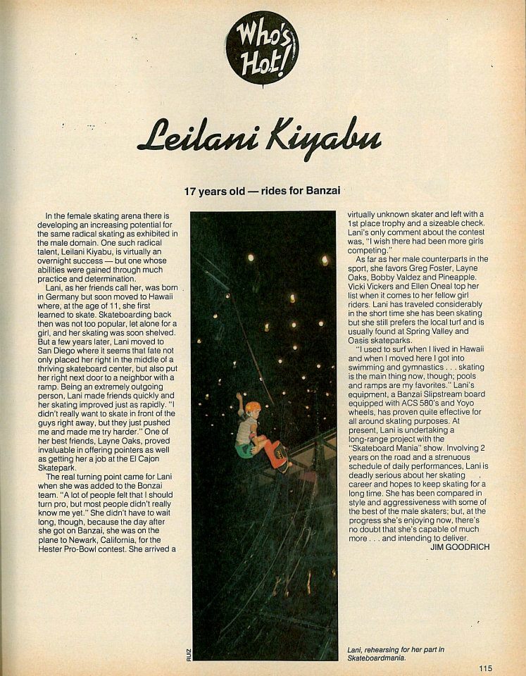 - Goodrich, Jim. “Who’s Hot: Leilani Kiyabu.” Skateboarder. December 1978.