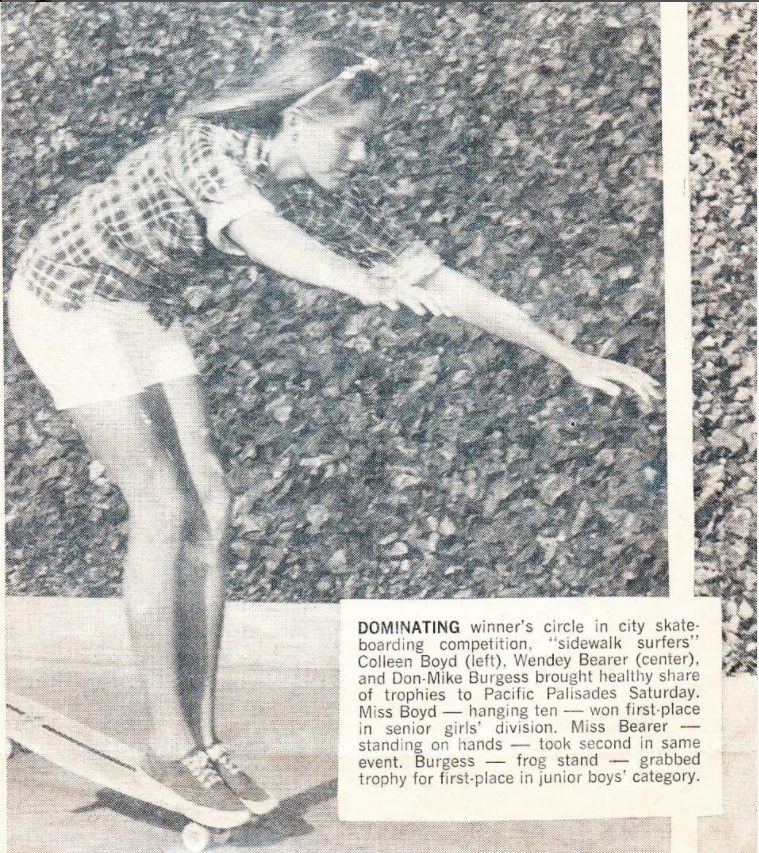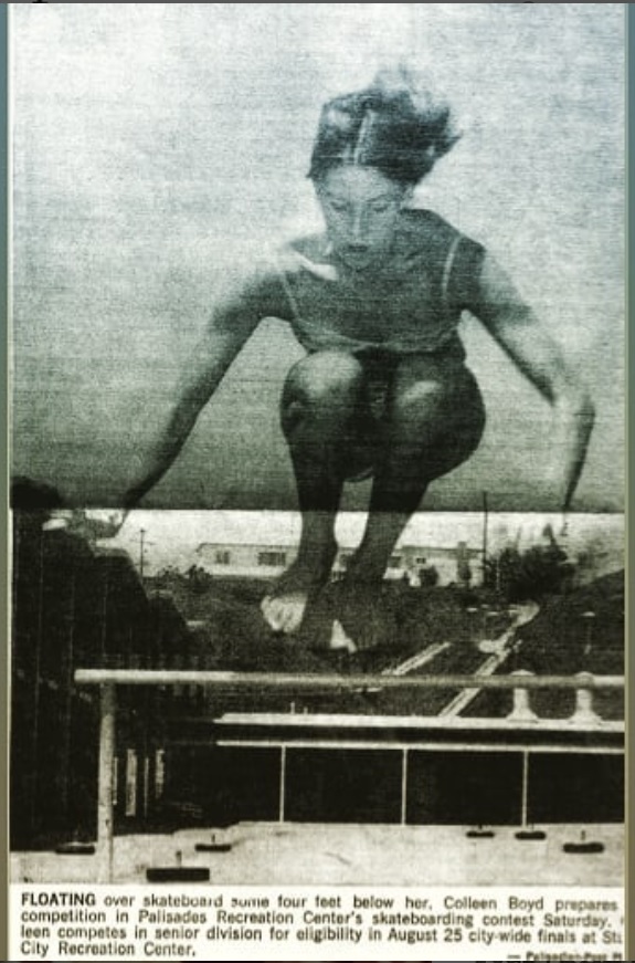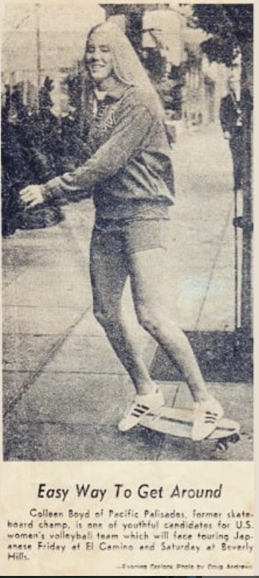 Colleen shared for the Encinitas Advocate that she was five years-old when she set foot on a skateboard. It was 1956 and her big brother Greg hammered steel Mickey Mouse roller skate wheels to a piece of 2×4 plywood. Greg “plopped me down on my butt on the board at the top of the driveway and gave me a push.” Her parents were very supportive of her athletic pursuits, including surfing and volleyball.