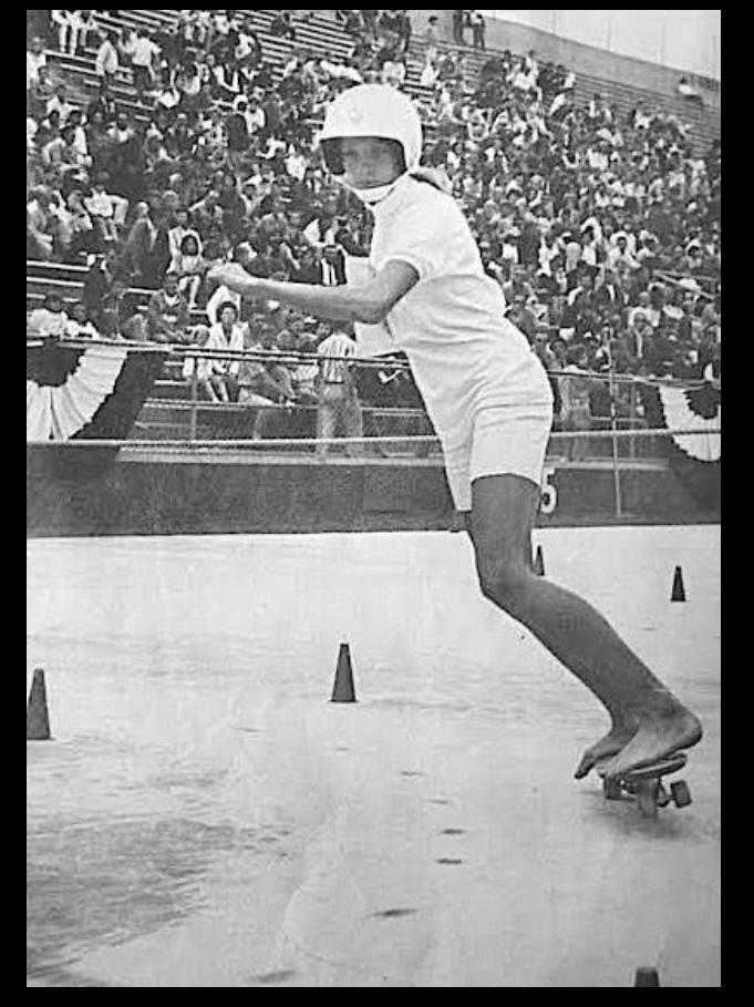 The first International Skateboard Championships in May 1965 was held at La Palma Stadium in Anaheim. It was televised by ABC’S Wide World of Sports, and Colleen’s barefoot performance was featured, which gave her 2nd place with 24 points just behind Laurie Turner DeMott. Colleen won the flatland slalom, was 2nd in the figure eight, and 2nd overall for Girls. The results and photos were also published in the August 1965 issue of Skateboarder magazine.