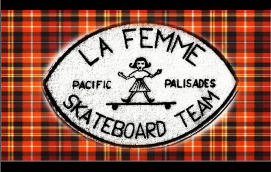 La Femme was a women’s clothing shop who provided the girls with matching plaid wind-breaker jackets, and then Suzie’s mom made 10-inch back patches to make it official. Colleen writes that this was in response to the fact that the boys’ teams weren’t interested in them, and so they wore their jackets proudly “while skating around town until the Palisades and Hobie Skateboard Teams recruited us.”