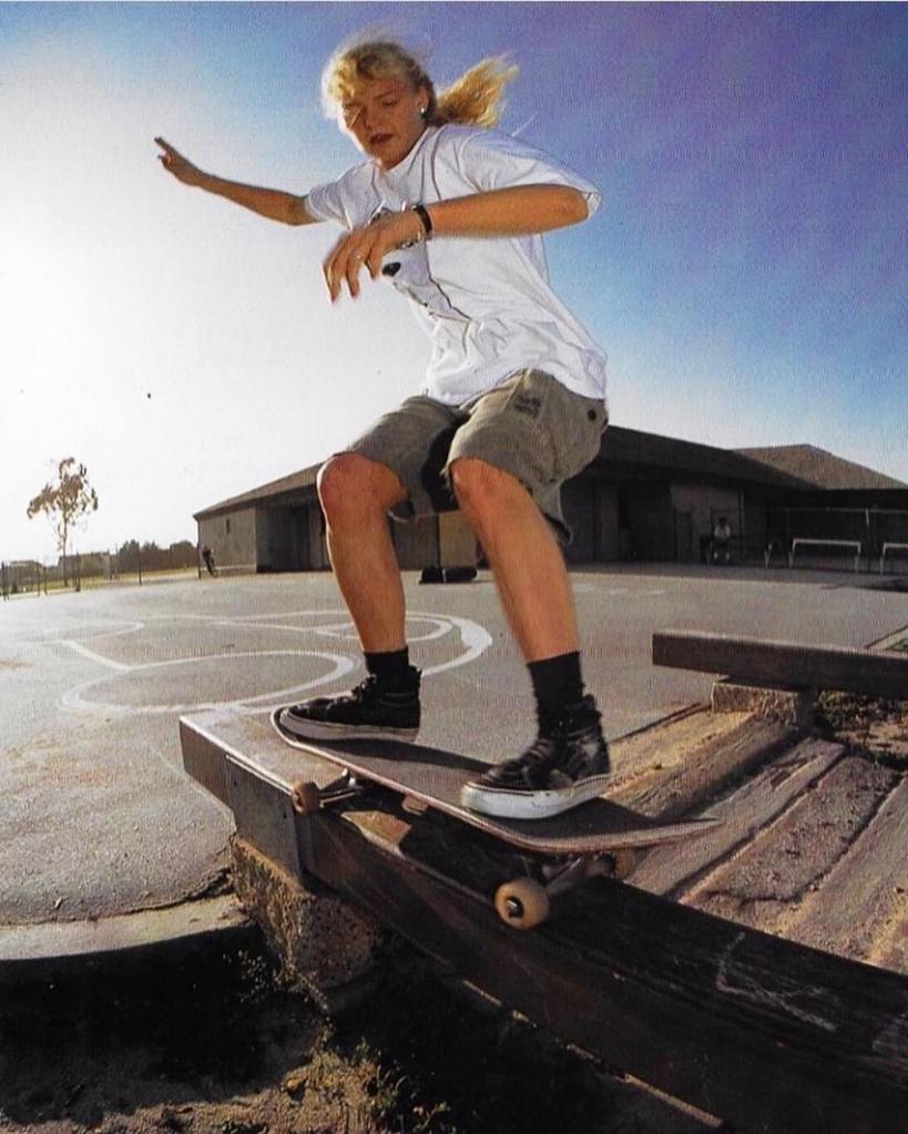Regarding her first handrail, Saecha said, “I think I was sixteen at the time [1989]. I started doing contest handrails then, eventually I learned how to do it on a real handrail. It was definitely an accomplishment for me.” Saecha’s friend, Christy Jordahl confirmed that while they were both board-sliding obstacles, Saecha was the one board-sliding handrails. They two Huntington Beach skaters had a great time together, and Christy explained that one of their favourite spots was “Hell Curb” conveniently located near a Dunkin Donuts, which they enjoyed!