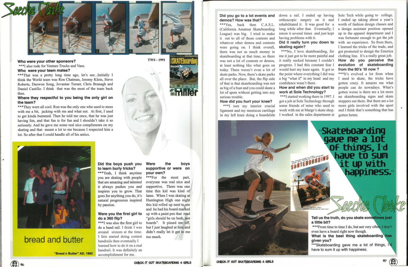 More recently, in the June 2019 issue of Thrasher, Michael Burnett interviewed Saecha where she shared more of her history, like skating for Rocco at World Industries, and some words of wisdom she wished she could have told her sixteen-year-old self. A fantastic feature!