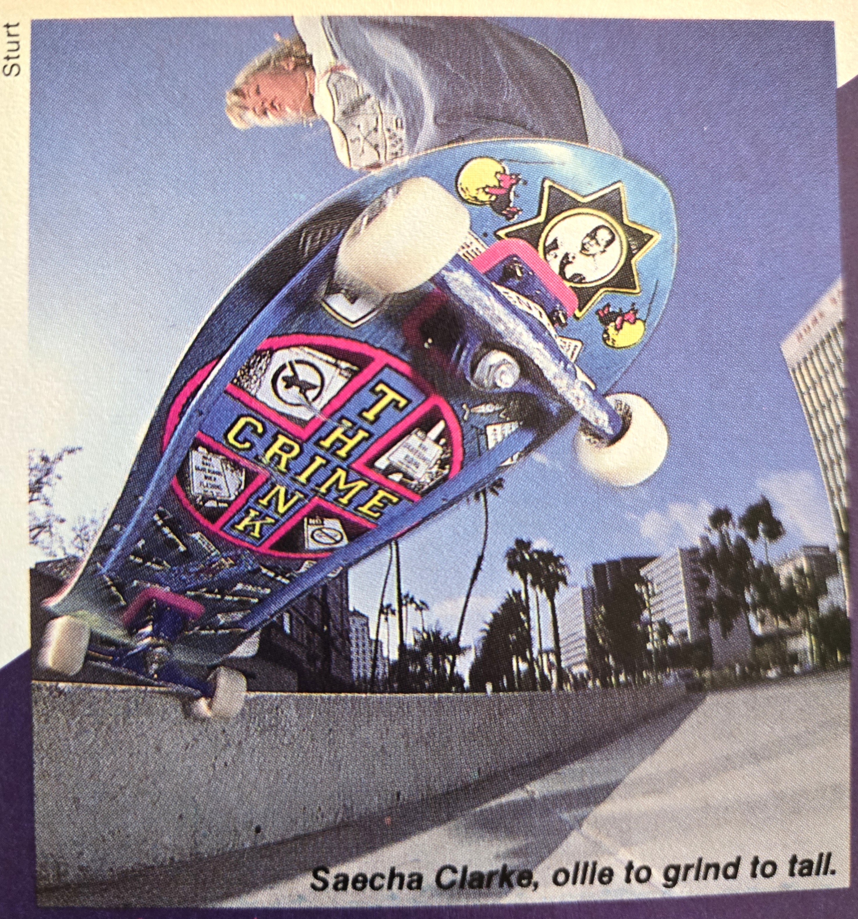 Saecha also noted that, “The first photo I ever got in a skate magazine was an ollie grind to tail on a small ledge outside the Long Beach Convention Center. It was taken during a trade show by Dan Sturt for Poweredge Magazine [March 1989]. I love the Think Crime board graphic I was riding at that time, it was such a cool graphic from World” (Bradley).