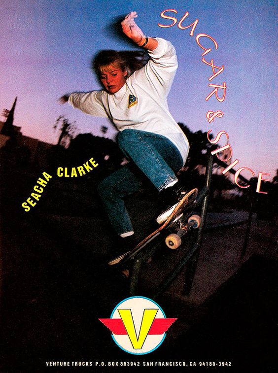 In the late 1980s and early 1990s, Saecha Clarke proved to be the leading female street skater, among a small but elite crew. She grew up in Huntington Beach, CA and the local High School was a destination skateboarding spot, so she would skate there with whoever was hanging out.