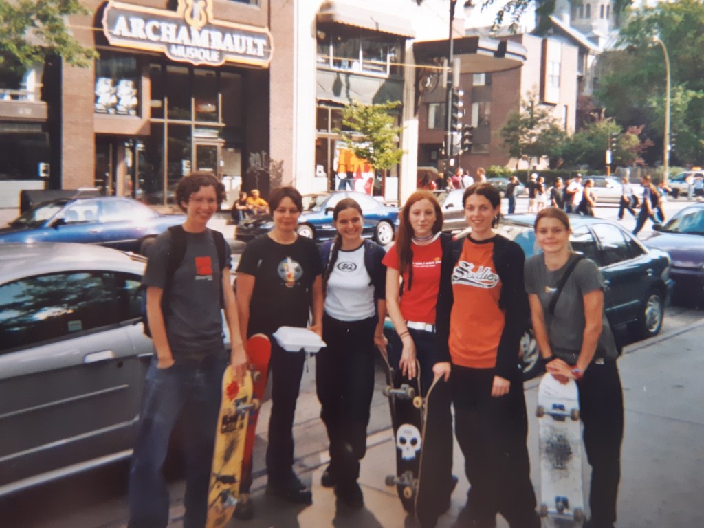 Once her daughter had a support network and school to attend, Marie-France began to return to her favourite activities with more attention. As a beginner skateboarder, “I started out by myself in front on my street, smashing myself all over the place to figure out how this thing was working! And it was pretty pathetic. I was bruised.”