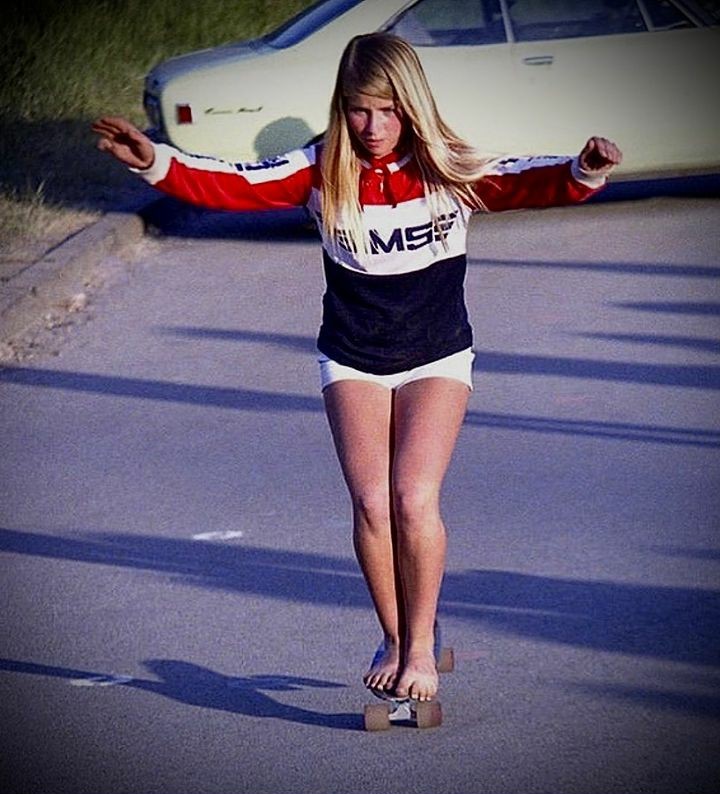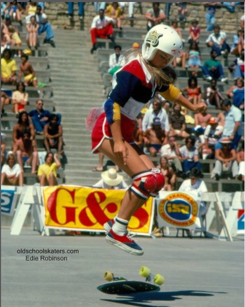 Edie was part of the scene in skateboarding movies like The Magic Rolling Board (1976), Freewheelin’ (1976) and Skateboard: the Movie (1978). Her abilities were diverse, as she enjoyed freestyle, slalom and transition skating.