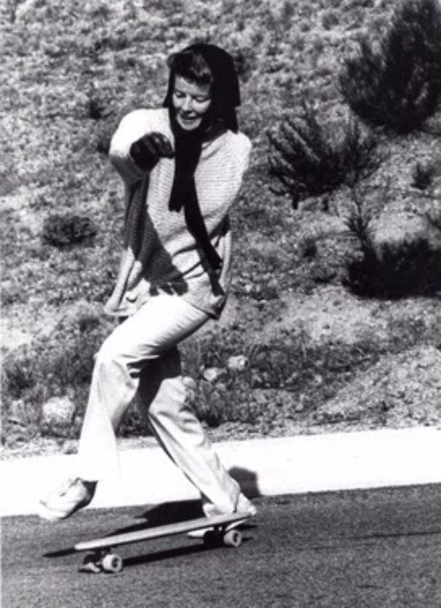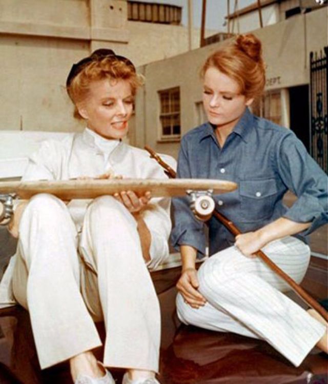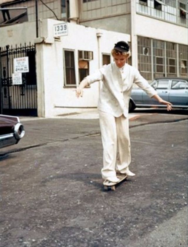 The most surprising actress has to be the elegant Katharine Hepburn, and it’s not just one random promo photo. While filming the movie, Guess Who’s Coming to Dinner (1967), which was a positive portrayal of an interracial marriage, Hepburn decided to give skateboarding a go, which was well documented. Hepburn’s niece, Katharine [Houghton] Grant was also performing in the film and based on one photo it appears that her niece, not her nephew Jack Grant introduces her to this new, trending activity. Although, most sources say that Jack was the avid skateboarder and took the photos.