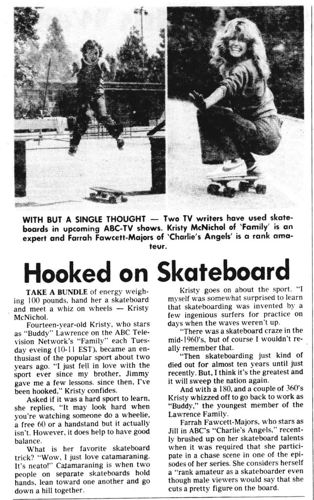 In January 1977, an article circulated in several newspapers celebrating the skateboarding action of TV celebrities Kristy McNichol and Farrah Fawcett, although Kristy had the most insight to share regarding her love of skateboarding, including a history lesson!