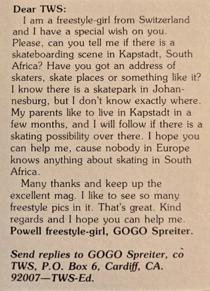 In the February 1984 issue of TransWorld magazine there was a letter printed by Corina desperate for information because her parents were planning to live in South Africa, and she was hoping someone could provide information about the skate scene there, although it sounds like the move was temporary.