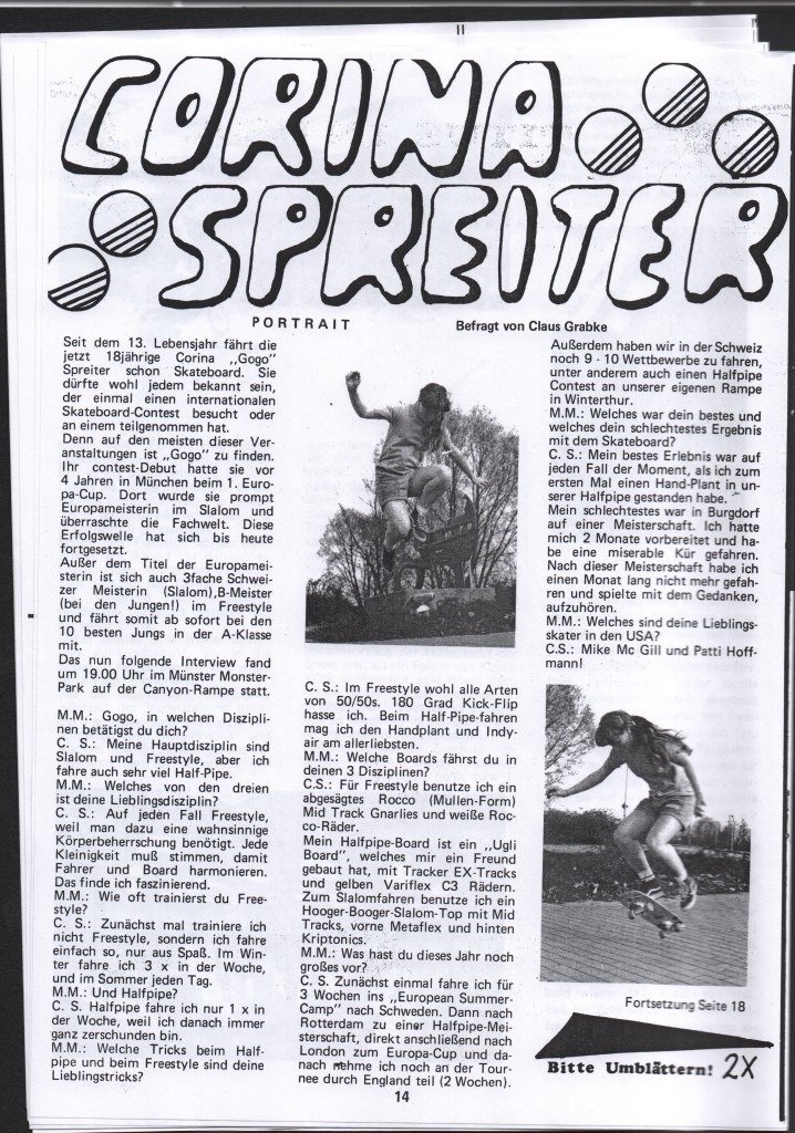 According to fellow Swiss skateboarder Ruedi Matter, he performed hundreds of skateboard demos with Corina back in the day. I would love to find an interview with Corina, perhaps in a European skateboard mag and to know more about how she began skating, if any companies sponsored her, etc.