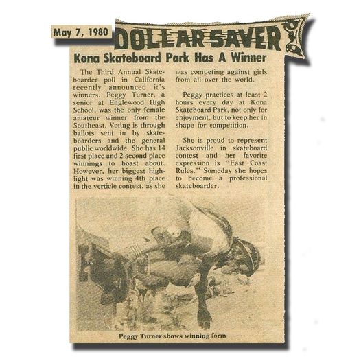 Peggy Turner appears in the results in the National Skateboard Review for a September 1978 contest called the Pepsi / Nova Team Challenge, placing first in Freestyle and Slalom, and third in Bowl and Cross Country. Peggy was representing Florida against teams from South Carolina, North Carolina, Virginia and Georgia.