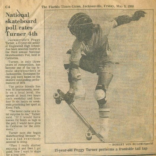 In a news clipping from May 7, 1980, it’s shared that Peggy Turner was honoured to be part of the Third Annual Skateboarder magazine poll, which ranked her fourth in the country. It was a big deal since readers had voted in their favourites and the contest tended to be dominated by skaters out of California. Peggy was seventeen – a senior at Englewood High School at the time and the only amateur winner from the Southeast.