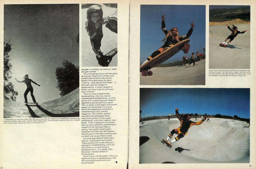 She acknowledged that the participation of women in skateboarding was increasing daily (approximately 10% at the time in Carlsbad) and she believed that “Once a skate lady puts her efforts into bowl and bank riding, there are no qualitative limits to competent riding.”