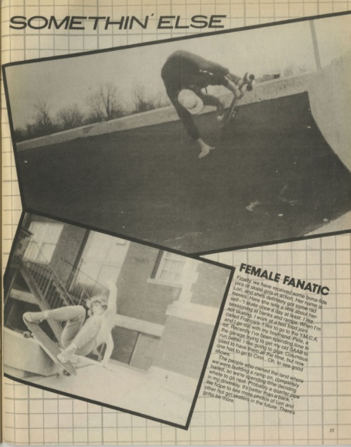 And then, in August 1984, on the “Somethin’ Else” page there’s a so-called “Female Fanatic” who is featured and it’s a slight improvement since the skateboarding photos are dominant. The editors include two photos of “Lori” who lives somewhere near Columbus or Cincinnati, Ohio and skates every day. Thrasher wrote, “We hope to see more photos of Lori and other hot girl skaters in the future.” A cringe-worthy statement, but not exactly surprising.