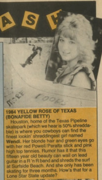 Finally, in April 1984 in the Trash section we’re introduced to “Wendi” from Houston, Texas. The absurd write-up goes, “Her blonde hair and green eyes go with her red Powell/Peralta stick and pink high top tennies. Rumor has it that this fifteen year old beauty can wail on lead guitar in a R ‘n R band and shreds the surf at Surfside Beach.” Notice how her profile photo vastly dominates the skateboarding photo?