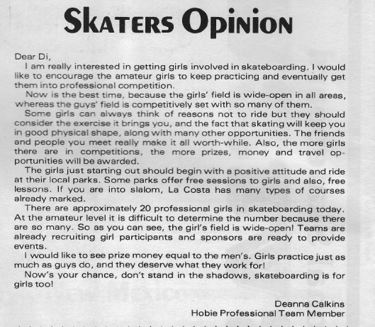In March 1978 for the Kona Pro-Am at the Kona Skatepark Deanna placed 4th in Pro Women Banked Slalom. The top five pro men received cash prizes from $2000 down to $50, and the women received nothing. Perhaps this experience is what prompted Deanna to write a fantastic letter to Di Dootson, which was published in the April 1978 issue of National Skateboard Review.