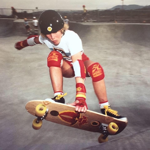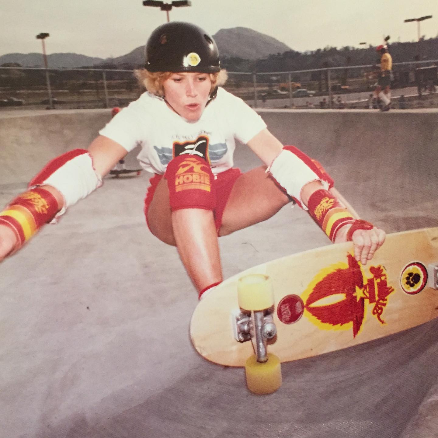 Deanna was born in Inglewood, California in 1959, and she ended up going to the same school as Laura Thornhill’s brother – South High School in Torrance. Deanna took up skateboarding in 1976 and just before graduation in 1977 she “discovered the slalom course at Skateboard World in Torrance, which came to her naturally. Employing a parallel ski stance, Deanna was beating everyone on the slalom course at the park within three weeks—and on borrowed equipment, no less!” (SHOF).