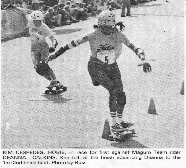 Di Dootson reported on the event in the December 1977 issue of the National Skateboard Review, which was full of drama! It was Calkins’ first pro event and in the preliminaries she took out Robin Logan to move into the semi-finals against Kim Cespedes, who had taken out Ellen Oneal. Kim ended up falling at the finish line, so Calkins advanced to the finals against Terry Brown who had moved forward after rounds against Judi Oyama and Ellen Berryman.