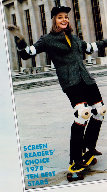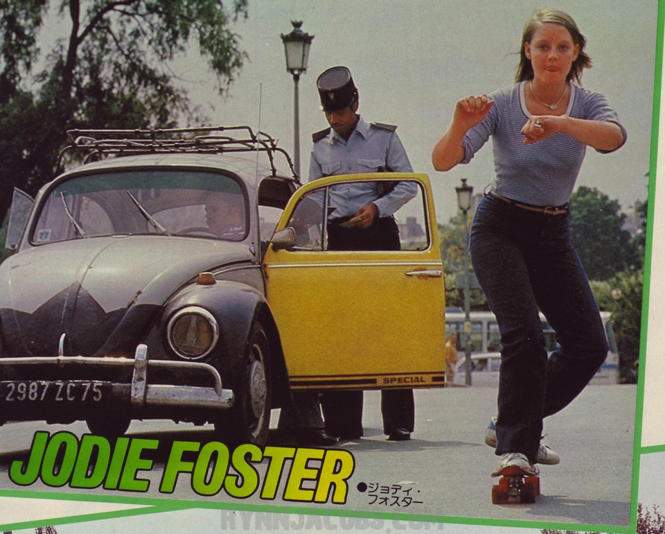 Deanna Calkins was included in skateboarding ads for Suntory soda pop and Arnold Palmer Sports Wear in the late 1970s, intended for the Japanese market. As well, Kathy Bomeisler had a gig filming a commercial for ‘BVD’ clothing (a company owned by ‘Fruit of the Loom’) intended for Japanese TV, as well as a soda pop commercial for Japan in the mid 1970s. Below, photos of actress Jodie Foster on her skateboard appeared in Japanese magazines in 1977 and ’78.