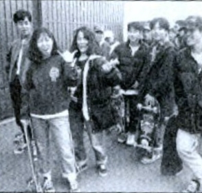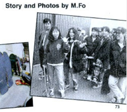 And then, in the March 1990 issue of Thrasher there’s an article called “Fistful of Yen” by M. Fo reporting on a mob of American bro skateboarders competing in Japan. Immediately, the photo that caught my eye was the tiny picture on the bottom right of page 73. There’s a rad female skateboarder chilling with her crew, giving the camera a “hang ten,” and of course, she’s not referenced anywhere in the article. Who was she?