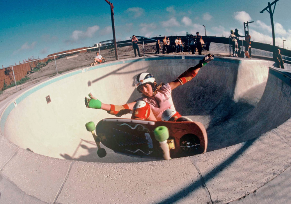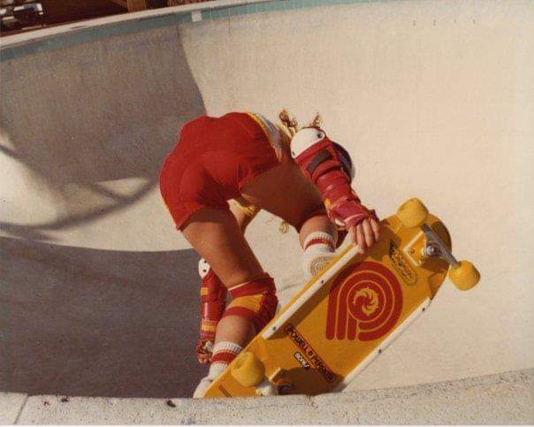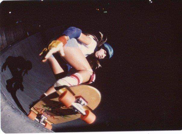Cindy returned to skateboarding in the mid-1970s at age 14 with more focus, cruising the streets and around the Hermosa Pier starting out in freestyle. In an interview for Skate Punk, she said “I wanted to be better at something than my older brother – he was a star swimmer / water polo player. He couldn’t even do a 360 on a skateboard.” Cindy met her best friend, skater Michelle Kolar-Scott on Hermosa Pier where there were many skaters hanging out. Cindy was soon noticed and her first sponsor was the Weber team.