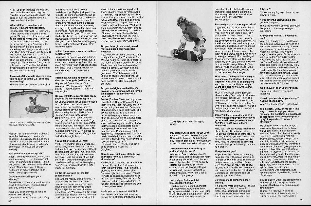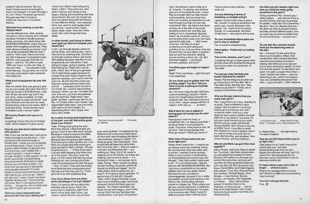 While there was some awkward discussion on dieting and “femininity” in the interview, rooted in a time-period that was still binary and fixed, Vicki’s message was intended to be encouraging. She said, “You have to push yourself because being a girl in skateboarding, that’s the only person who is going to push you is yourself…” Vicki then acknowledged skateboarders like Brenda Devine, Leilani Kiyabu, Kim Cespedes, Terry Lawrence, her roommate Lori Rarey, and her protégé, up-and-coming skater Canon ‘Bunny’ Price.