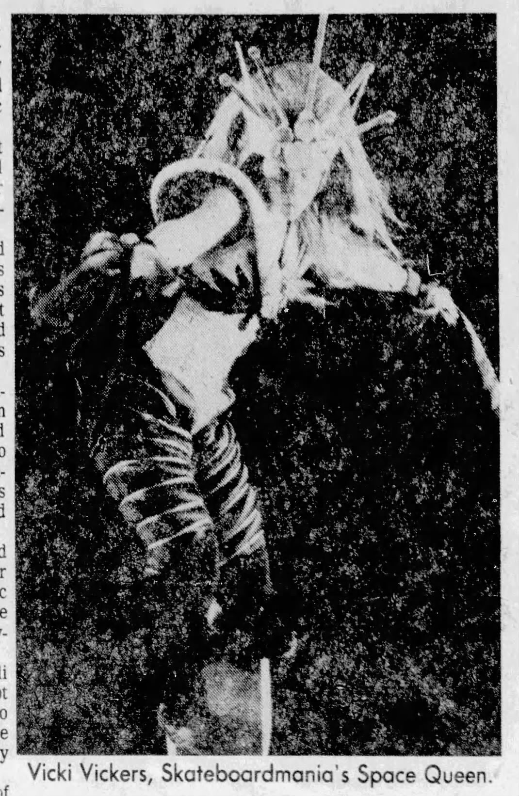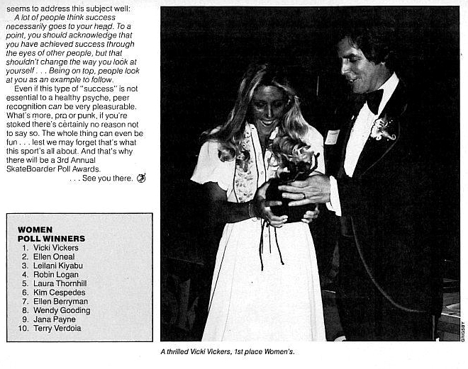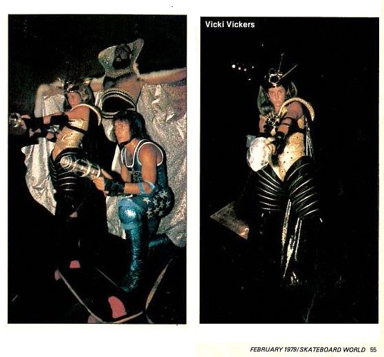 At the second annual Skateboarder Poll featured in the June 1979 issue of Skateboarder, Vicki was voted in as the “Female Skateboarder of the Year.” Vicki also had the opportunity to join the touring Skateboard Mania show that year with the role of “Space Queen,” which premiered at the Los Angeles Forum. As well, she traveled to Caracas, Venezuela in early 1979 along with Lori Rarey, Laura Thornhill, Chris Chaput, Paul Hoffman, Bobby Boyden and Tony Jetton.
