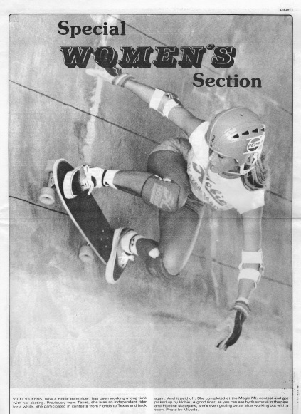 While attending the National Surfing Championships in Port Isabel, Texas, Vicki Vickers at age 14 overheard Dogtown skater, Nathan Pratt declare that “Girls Can’t Skate.” At age 18, in her Who’s Hot!” article within the December 1978 issue of Skateboarder she told Jim Goodrich that she took Pratt’s comment seriously and immediately started skateboarding! Vickers would continue to be a vocal advocate for equal pay and support for women skateboarders throughout her career.