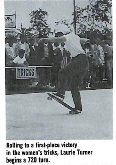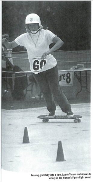 Laurie candidly shared with journalist Cathy Jetter that the Anaheim experience also included a team dinner at the Disneyland Hotel, a custom surfboard from Hobie, and a $500 college scholarship. “Skateboarding was a godsend for me… My family was going through hard times; my parents were divorced, my dad wasn’t around. Back then that was the exception, not the rule… That positive label of champion got me through lots of difficult times.” Skateboarding essentially kept Laurie active, surrounded by friends, away from her house, and distracted from problems at home.