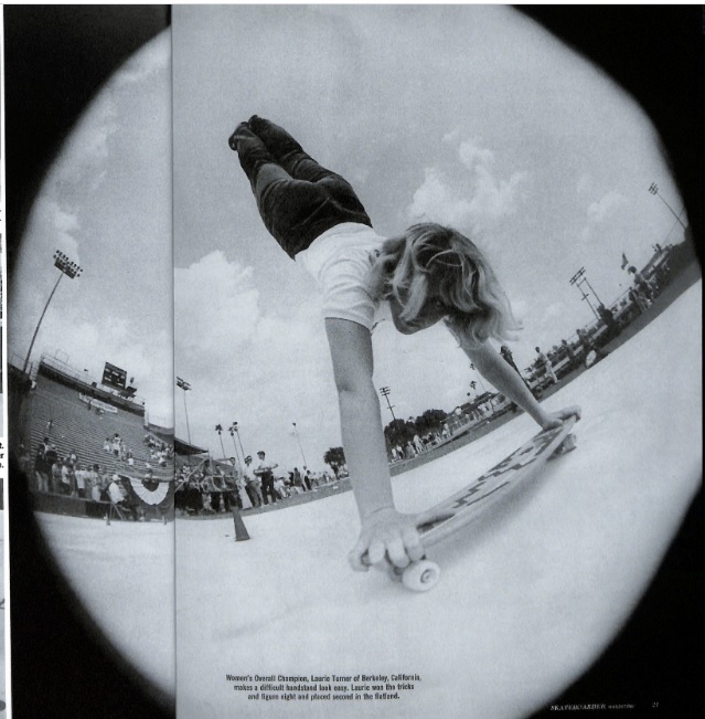 The first appearance in a skateboarding magazine of a female skateboarder (and photographer) was of Laurie Turner from Berkeley, CA in Volume 1 / Number 1 Winter 1964 issue of The Quarterly Skateboarder on page 37. The caption reads, “Laurie Turner of San Diego submitted three photos above with a note that the money received for the photos would go toward a very worthy cause – her first surfboard… Laurie shot the photos at the Whittier school grounds in Berkeley and receives $15.00 – toward her new surfboard.” Two of the photos are of her friends “Bootsey” McGhee and Danny Escalante, and one is of her.
