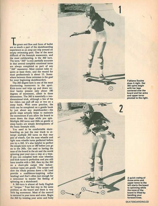 In 1973, Fabiana Duclos (Badie) received her first skateboard and within four years she was being recognized as a freestyle expert. Fabiana was showcased by the Wild World of Skateboarding magazine first in July 1977 within a 4-page feature on how to perform a 360, while skating at the Montebello skate park.