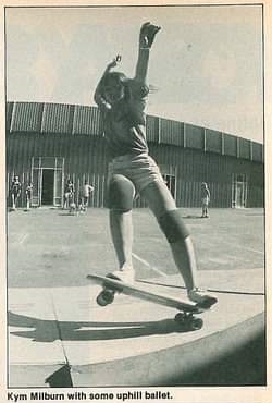 Kym appeared in a Tracker trucks ad for the November 1978 issue of the National Skateboard Review and was also documented in the May 1979 issue of Skateboarder magazine by James Cassimus, during a freestyle competition at Lakewood skatepark from February 1979. She won the 16-19 women’s 3A division.