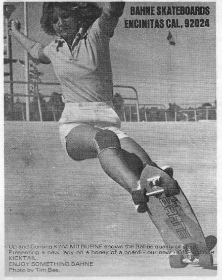 Photos of Kym appeared in several magazines including the June 1977 issue of Skateboard World performing “uphill ballet.” Her sponsor Bahne featured her in an ad for the January 1978 issue of the National Skateboard Review.