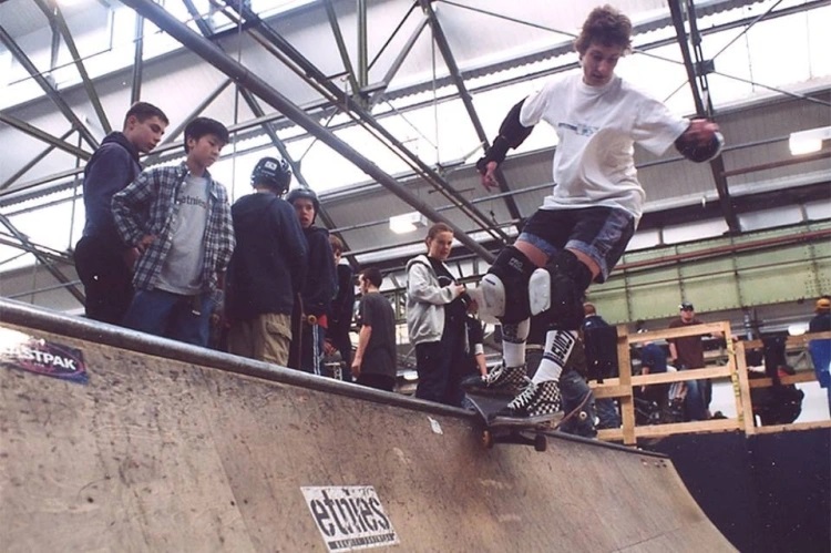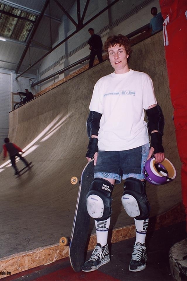 In 2001, when Sue was 40, she received another proper interview in a UK skateboarding magazine called Sidewalk. Sue remembers rushing to the venue after work for a photo session with Wig Worland on a sweaty hot evening.