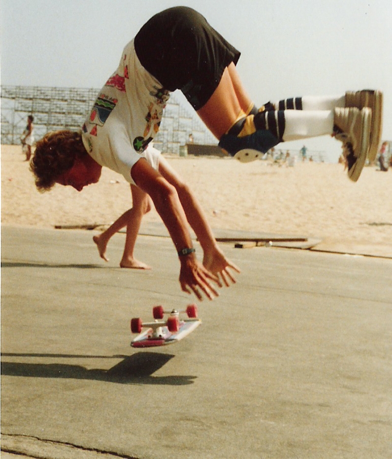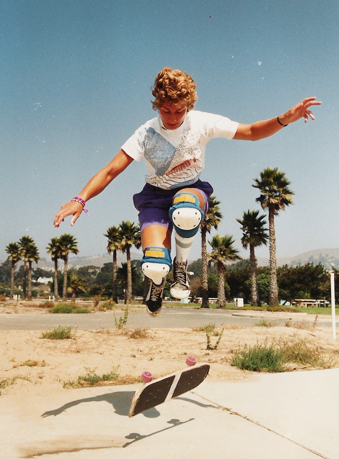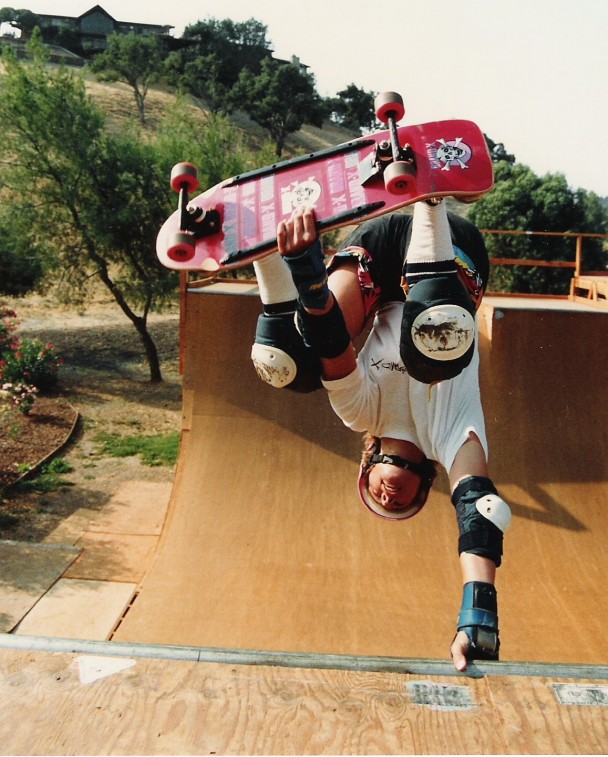 The photo below (c/o Sue Hazel) shows Sue at age 15 skating an aluminum deck with home-made elbow pads and gardening gloves. Sue shared, “I practised ’til I got this handstand the entire length of my cul-de-sac going downhill.”