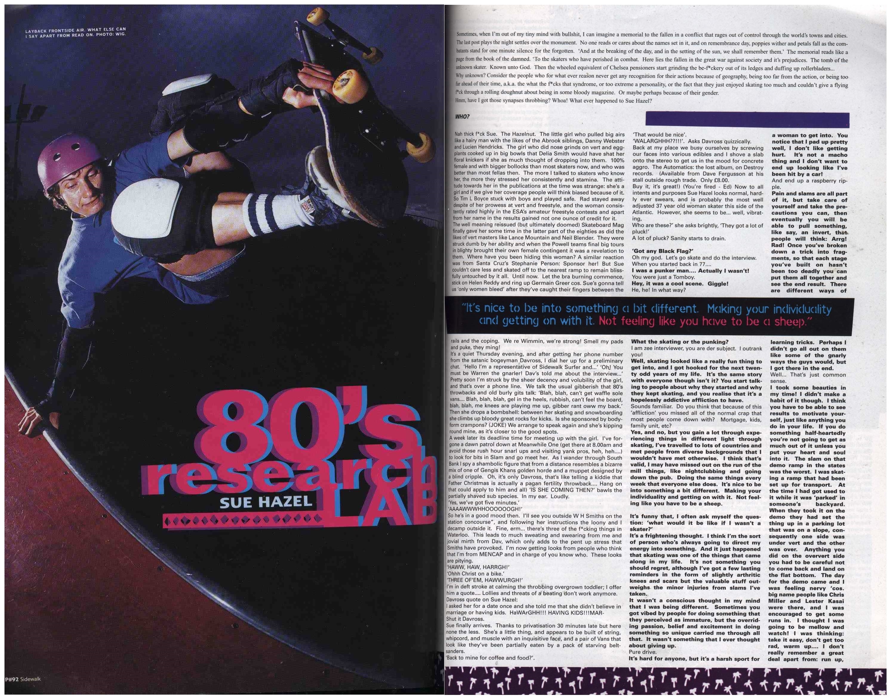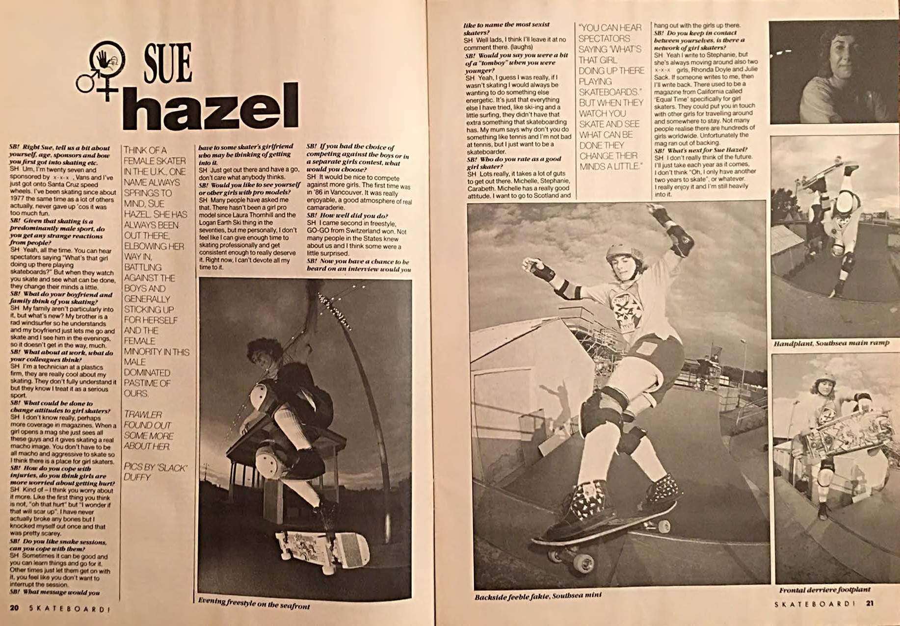 - Lawer, Mark. “Sue Hazel: Interview.” Skateboard! (Re Start Session 6). November 1989: 20-21.