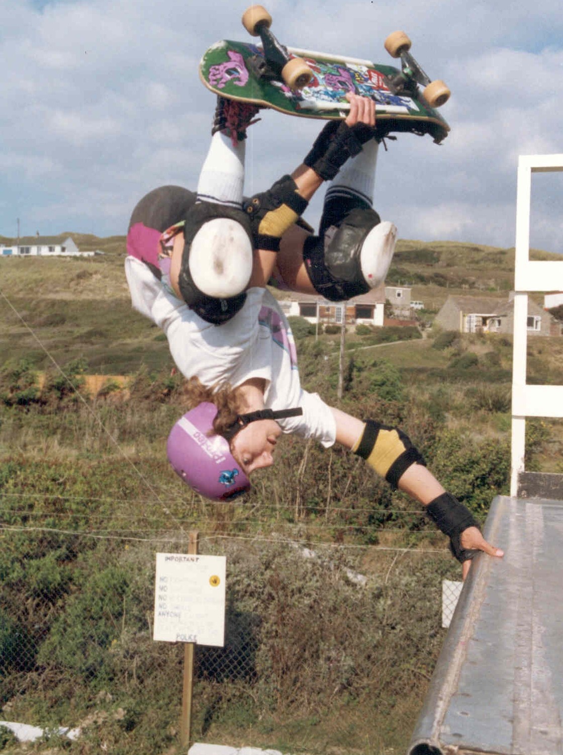 When Christine asked about how she was treated in the early days as a female skater, Sue replied, “I can’t really remember any particularly bad vibes from other skaters, I was just one of the crowd; albeit a girl. I loved traveling and visiting different scenes, and still do.” Sue was mainly focused on learning new tricks. “I remember the first time I really committed to coming in backwards out of a rock fakie on the Farnborough vert ramp – I slammed so hard on my back! After a while sitting out recovering, I got on the board again to get it wired, just made darn sure in future attempts I didn’t let my wheels hang up on the coping.”
