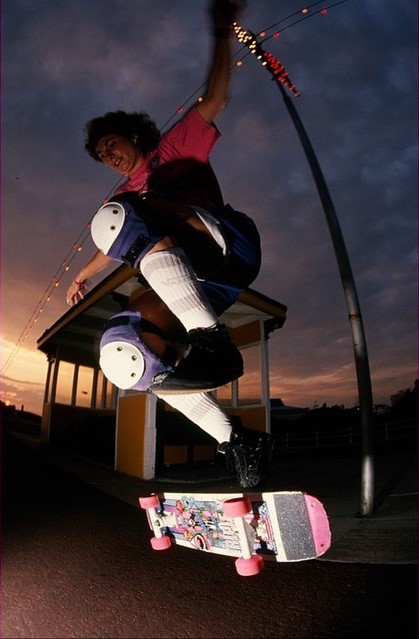 Even after the skateboarding craze started to calm down, Sue persevered. She didn’t know any influential skaters but “every fortnight, I’d put my pocket money towards a bus ride to Southsea Skatepark, to meet other local skaters and learn to ride bowls… Seeing any other female skaters was always an inspiration, there weren’t too many” (Cauble). Sue noted that during the first phase of popularity there had been a mix of genders, but everyone ditched their boards not long after.