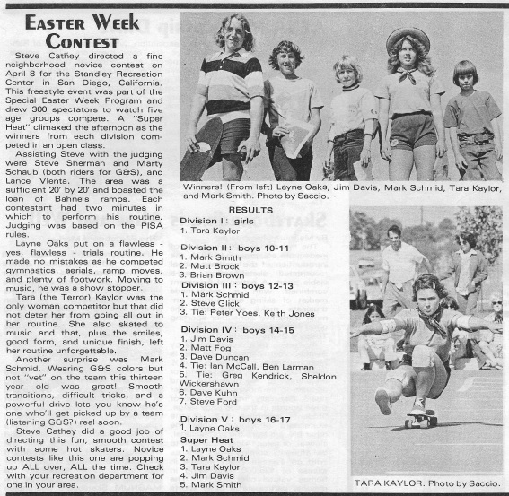 In the Skateworld Journal, November 1977 issue a small photo of Tara appears after placing second in the girls Freestyle event behind Julie Cheng, and ahead of Suzette Owens at the Runway (the first park in Gardena, CA). This was a pro-am contest on October 8, 1977 and was considered the 1977 USSA California State Skateboard Championships. The following month, in November 1977 Tara placed second in Freestyle and fourth in Slalom for the girls’ category at the Concrete Wave contest in Anaheim, CA.