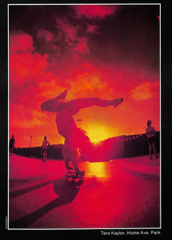 In a more artsy photo by Jim Goodrich, a photo of Tara Kaylor at Home Avenue Park (aka “Moving On”) in front of the setting sun appeared in the April 1978 issue of Skateboarder magazine within the article called “Focus.”