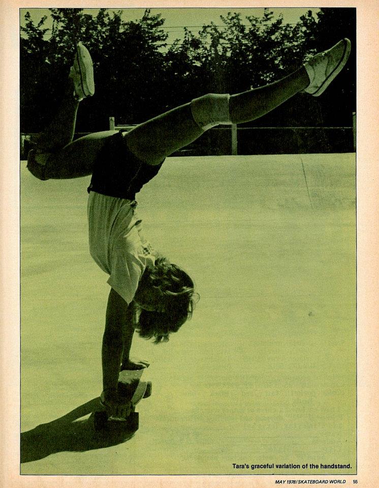Chuck Saccio of Skateboard World featured Tara in a two-page article for Skateboard World magazine in their May 1978 issue. Apparently, it was Steve Cathey who gave Tara her first skateboard back in February 1977 to learn how to ride, “Eight months and six contests later she had taken four first places and one second place in Freestyle.” Tara shared that her success wasn’t for lack of practise, plus she was a competitive gymnast and track athlete (taking first place in high jump at San Diego’s Junior Olympics!). Tara seemed serious about her freestyle activities, relating them to performances in theatre where you have to “communicate with your audience. Show them you are relaxed and in control.”