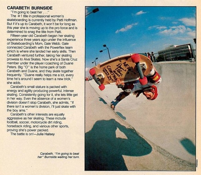 This would be the first interview / feature of Burnside in a magazine. Halsey shared that, “Fifteen-year-old Carabeth began her skating experience three years ago under the influence of Skateboarding’s Mom, Gale Webb. Gale connected Carabeth with the Powerflex team which is where she landed her early skills. Then Carabeth ventured further, taking her skating prowess to Alva Skates. Now she’s a Santa Cruz member under the player/coaching of Duane Peters. Big ‘O’ is the home park of both Carabeth and Duane, and they skate together frequently. ‘Duane really helps me a lot, every time he’s around I seem to learn a new trick,’ she adds.” And in the photo you can see she’s riding a mini Duane Peters board, cut down to suit her size.