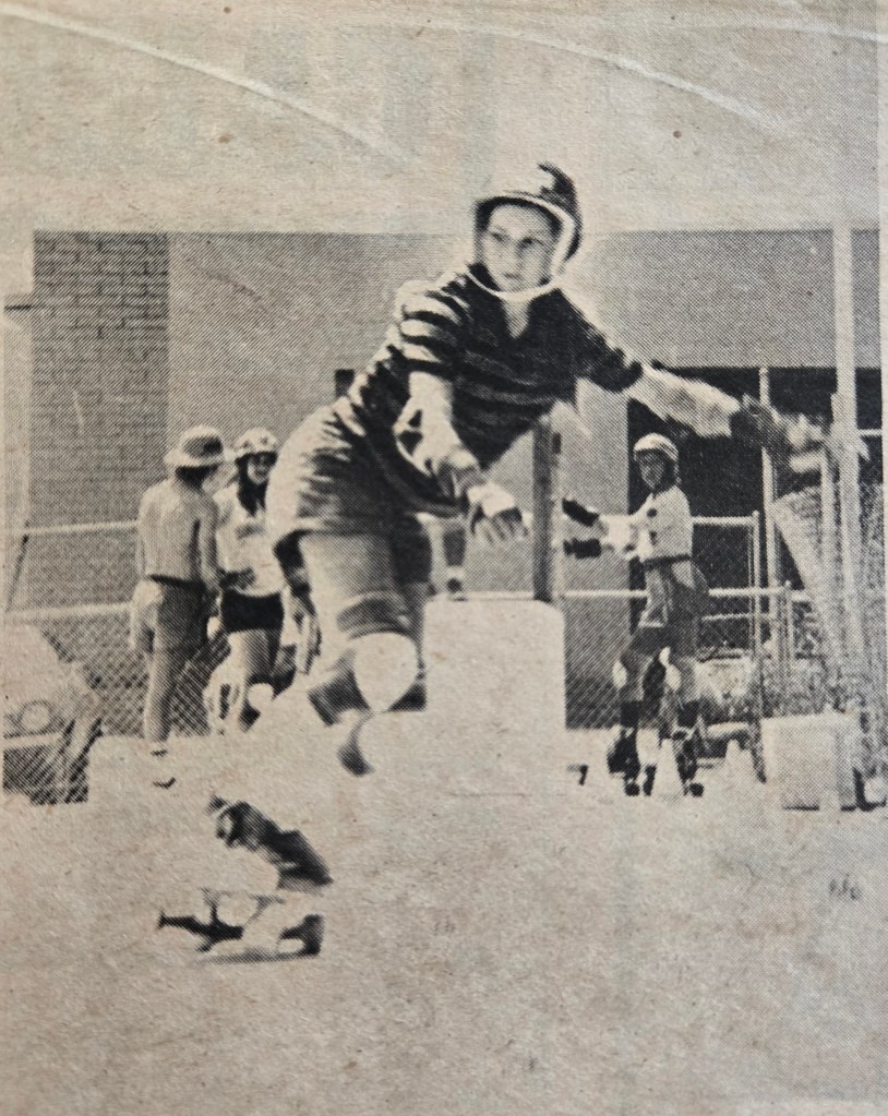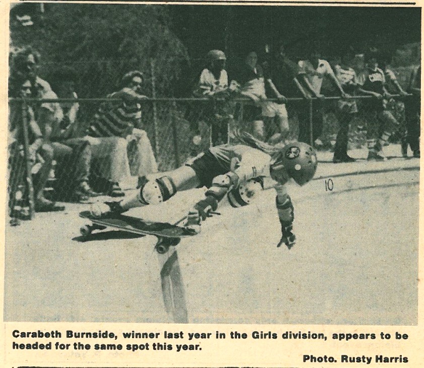 The photo above appeared in the March 24, 1981 issue of Skat’n’News with the caption “Ms. Carabeth Burnside, a lady at all times except when you get her in the pool, then, she’s a terror. She won overall at Skate City Pro/Am.”