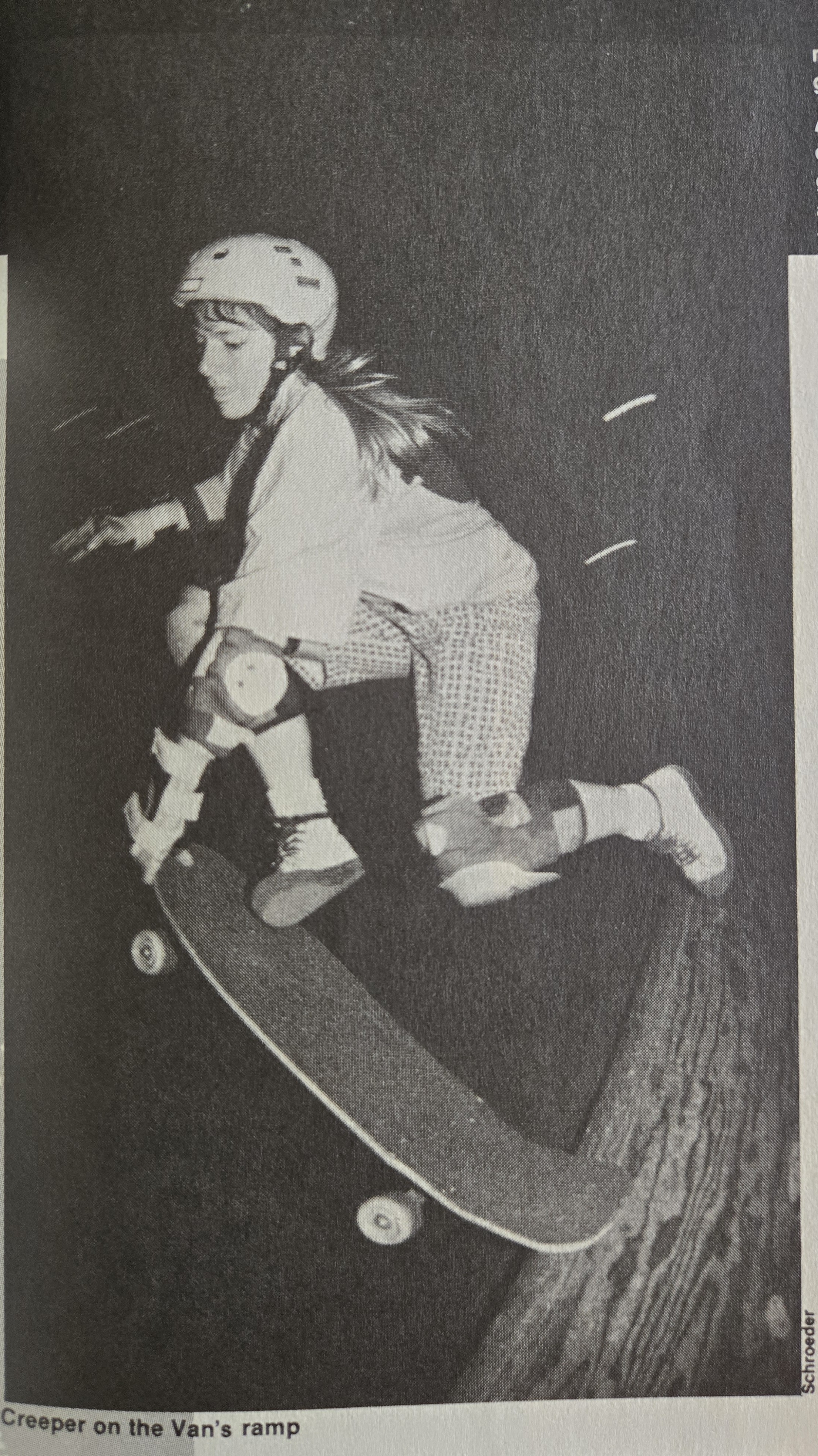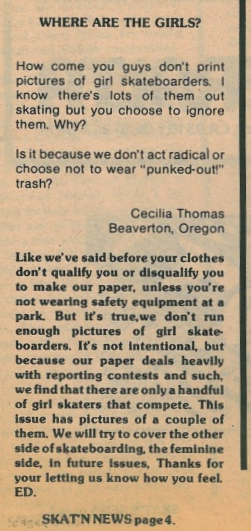 A letter written by Cecilia Thomas from Beaverton, Oregon within the December 30, 1980 issue of Skat’nNews titled, “Where are the Girls?” resulted in a photo of both Sue Smith and Cara-Beth! Cecilia asked, “How come you guys don’t print pictures of girl skateboarders. I know there’s lots of them out skating but you choose to ignore them. Why? Is it because we don’t act radical or choose not to wear ‘punked-out!’ trash?” The editors acknowledged that it was true and they would aim to step up.