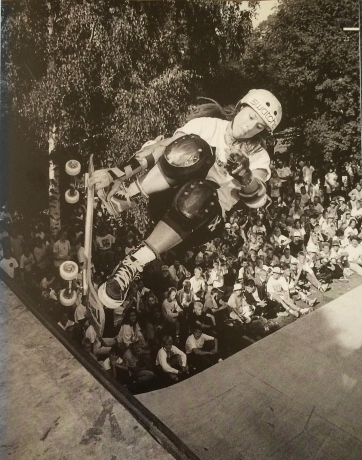 The photos above by Michele Peretti in the Munster bowl in Germany and Martin Willners from a demo in Stockholm, Sweden shows that Cara-beth had the opportunity to skate overseas in the 1980s, which was one of her goals.