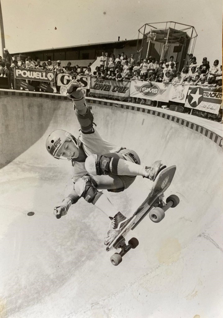 Cara-Beth was skating transition from the start, whether it was bowl, pipe, or pool. She first began to appear in contest results in the girls 13 & under categories in 1979, and she was soon recruited by Gale Webb for her Powerflex team, then Vans, Santa Cruz (which was announced in the August 23, 1980 issue of Skat’nNews), NHS, and Indy. The bi-weekly skateboarding newspaper, Skat’nNews reported on the scene, in particular the ASPO contest series: